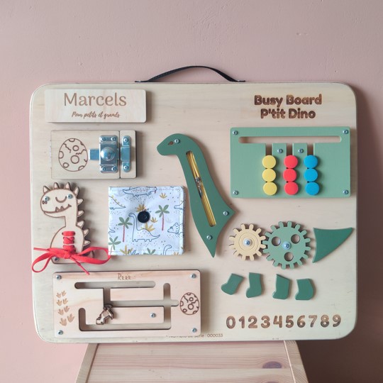 Cette planche d’activités « P’ti Dino » ou Busy Board est une planche d’inspiration Montessori.